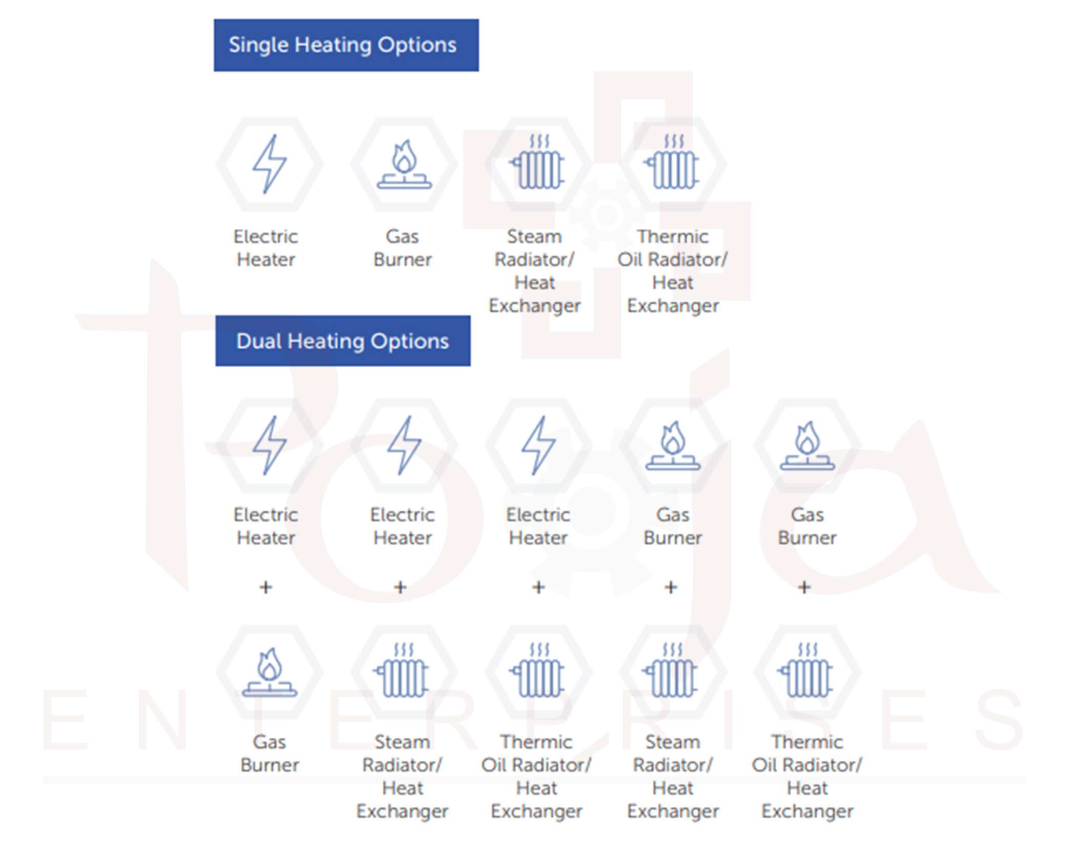 - Heating options (Electric, Steam, Oil & Gas) are available.